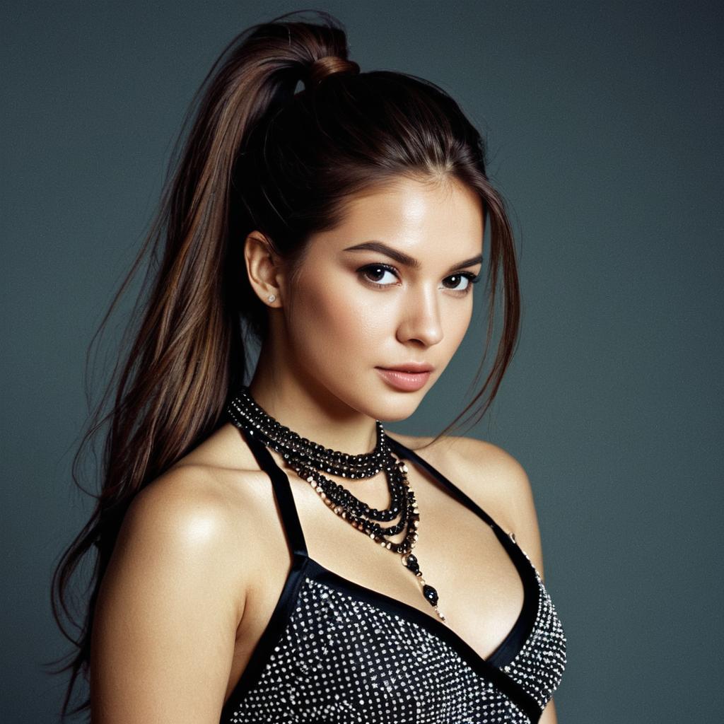 Funny costume single ladies,1girl, solo, dress, long hair, hair ornament, flower, hair flower, realistic, brown hair, lips, floral print, bare shoulders