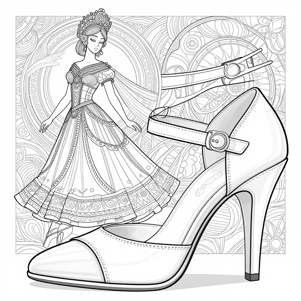 The image presents a detailed, monochromatic coloring page featuring a futuristic high-heeled shoe in the foreground. The shoe, with its intricate design and towering heel, is positioned prominently in the lower right corner. In the background, a delicate, ornate drawing of a woman in a flowing dress and elaborate headdress is visible. The woman appears to be walking, with her dress and headdress adorned with intricate patterns and textures. The overall composition is balanced, with the shoe and the woman's drawing creating a harmonious visual relationship. The coloring page itself is filled with various patterns and designs, adding depth and complexity to the scene. The interplay of lines and shapes in the shoe and the woman's attire highlights the attention to detail in the artwork.