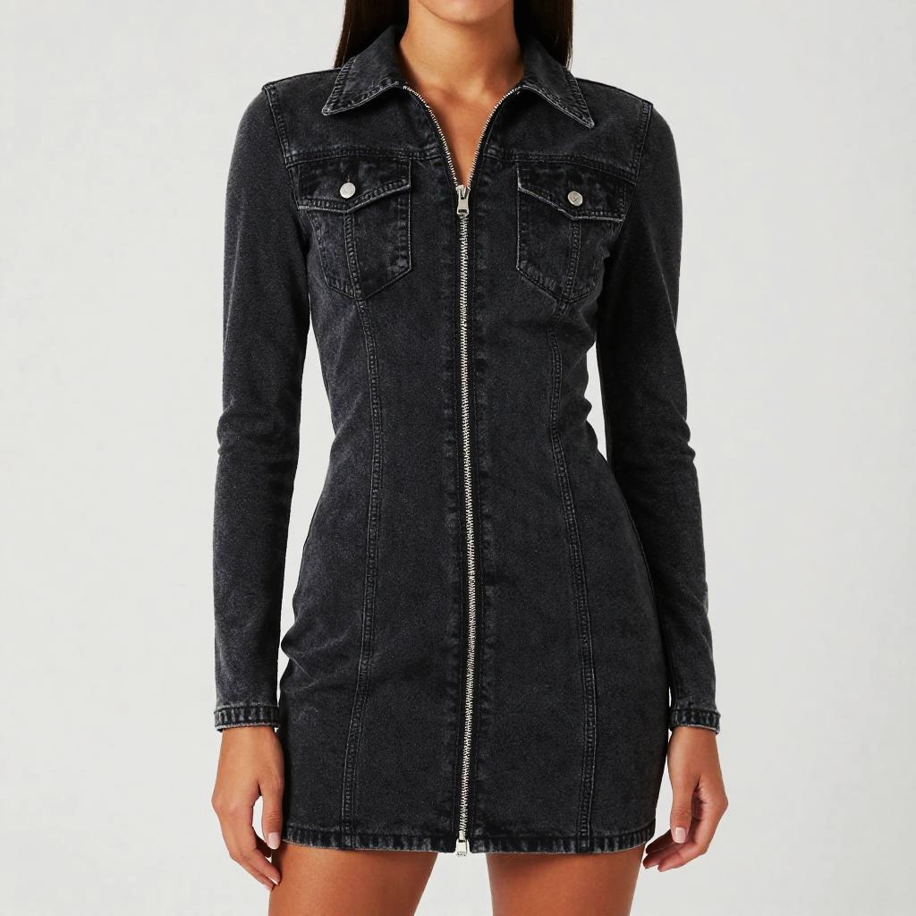 A confident woman models a modern black denim mini dress featuring a fitted silhouette and front zipper closure. The dress combines casual style with contemporary detailing, perfect for edgy everyday wear.
