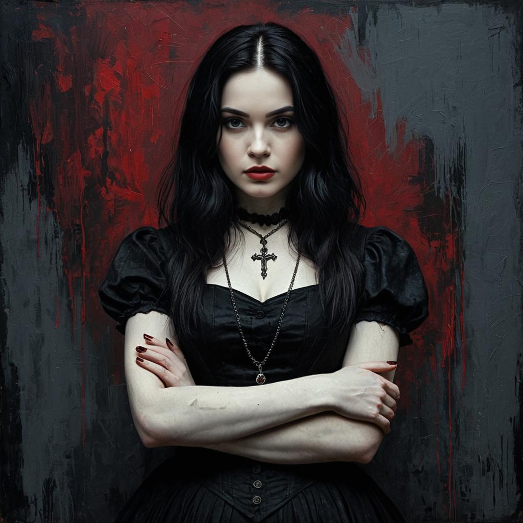 A gothic noir style woman standing on a balcony overlooking a futuristic city skyline at dusk, wearing a form-fitting black corset dress with pinstripes, long gloves, and a wide-brimmed hat, moody cinematic lighting highlighting dramatic shadows, purple and dark blue hues in the sky and city lights, elegant and mysterious atmosphere