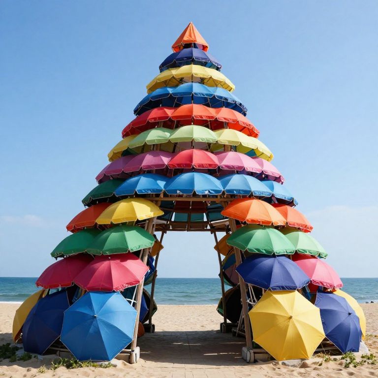 A vibrant pyramid of multicolored umbrellas, meticulously stacked in concentric layers, forms a whimsical archway leading to a serene ocean view under a clear blue sky.