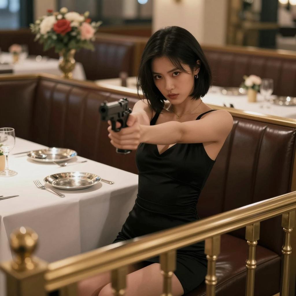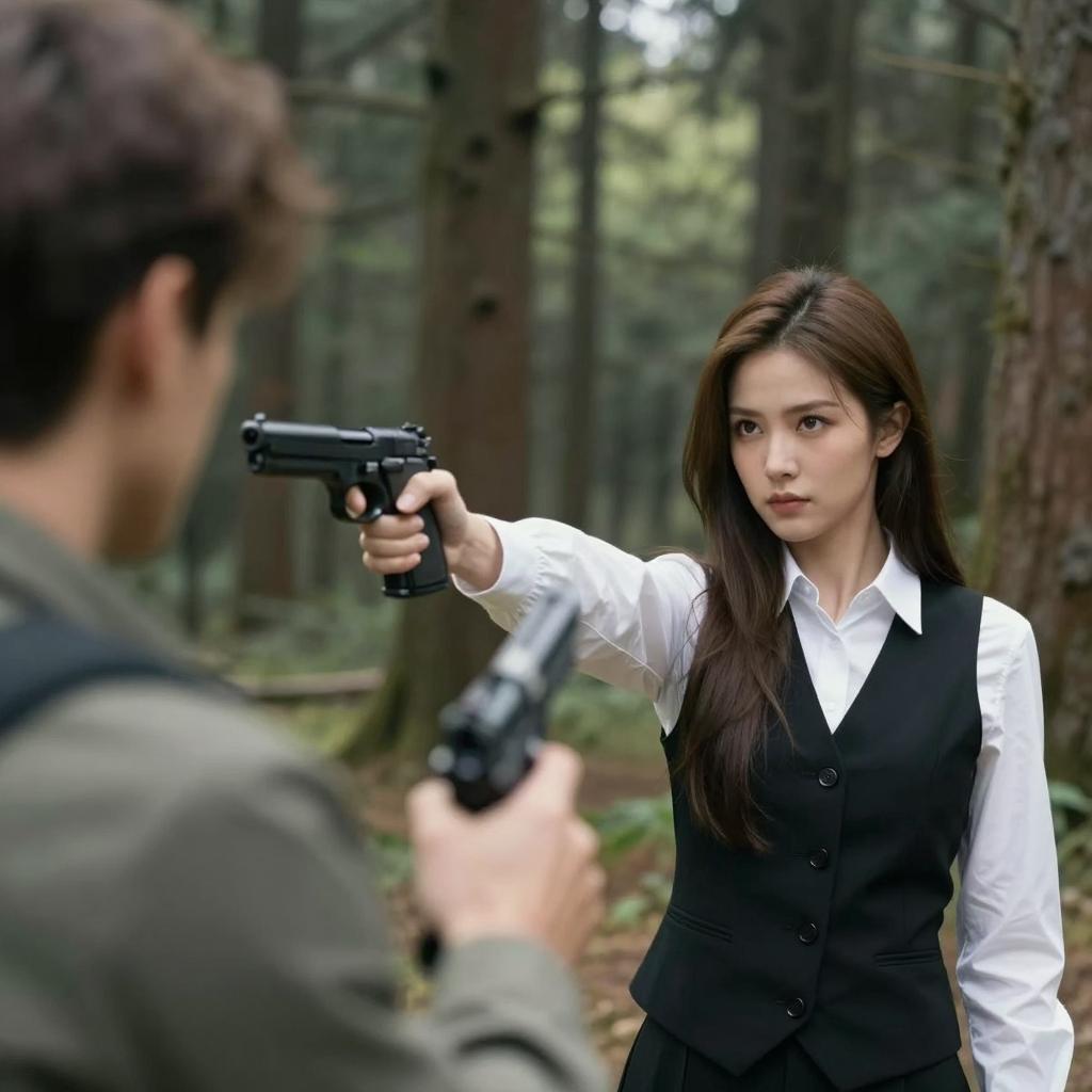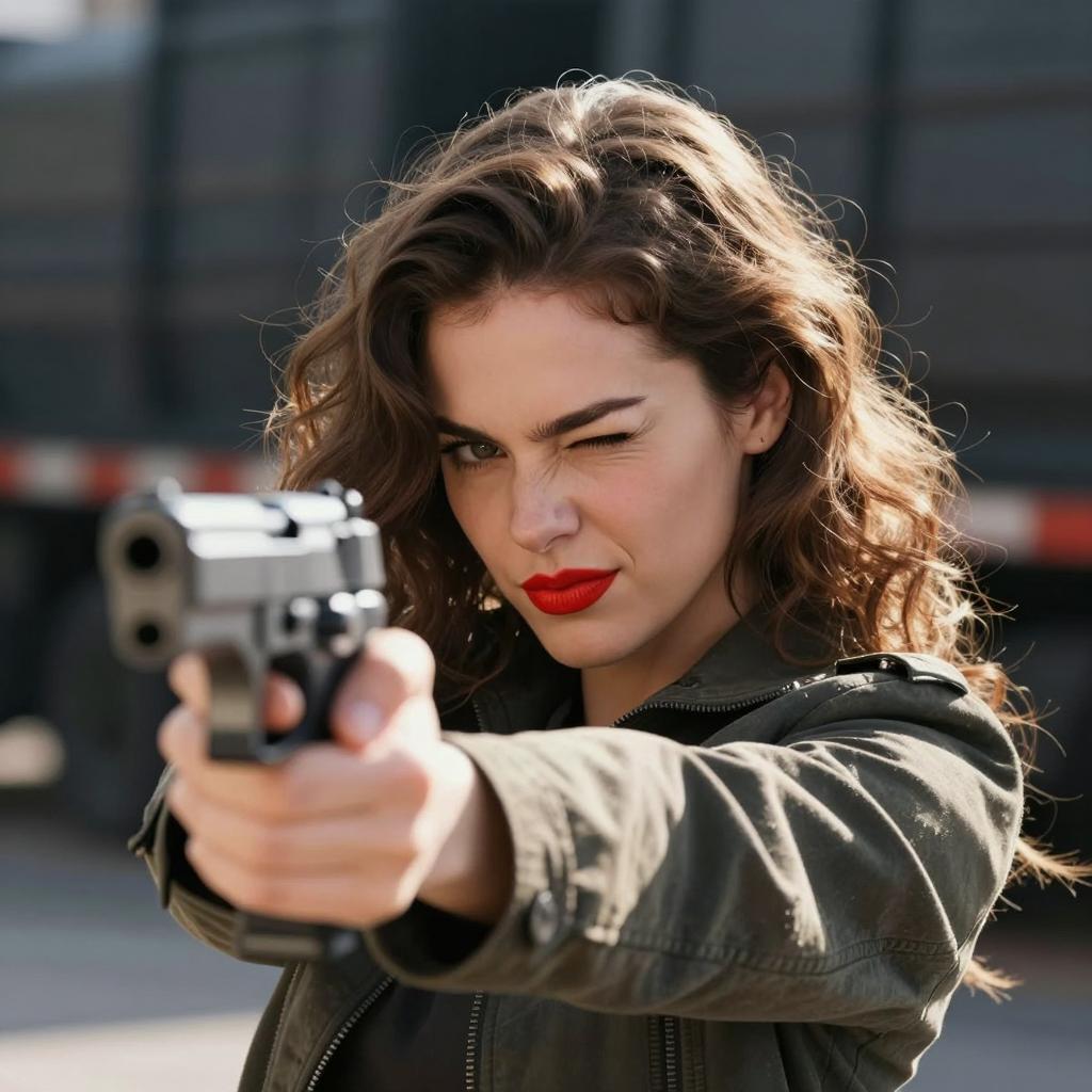 Woman with long brown hair, wearing a white blouse and pink skirt, points a black rifle aggressively at a mirror. Blue wallpaper with white floral patterns. Mirror reflects partially obscured figures. Woman's mouth open in a shout. Reflections show silhouettes. Woman in foreground, two people in mirror. Bright lighting.