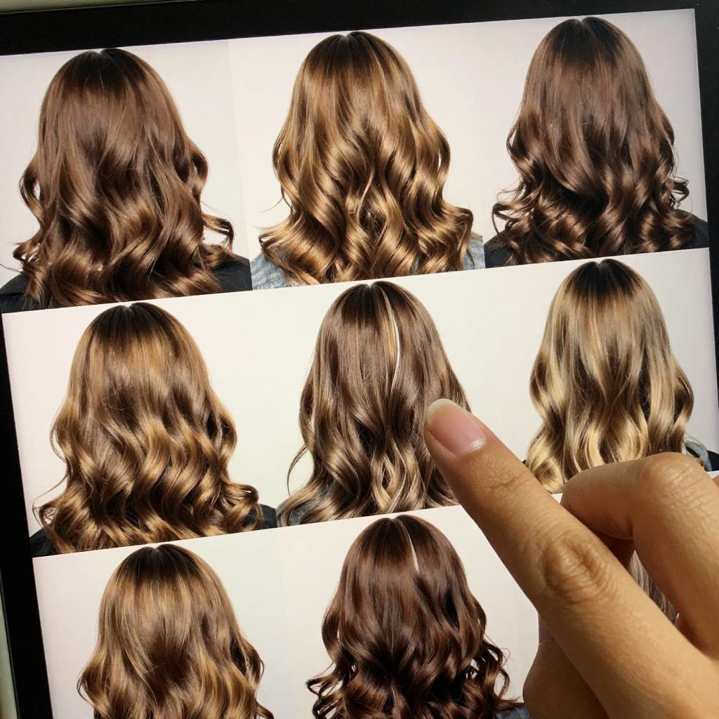 Hair style filter online preview on a tablet, showing transformation from natural to edgy and colorful hairstyles, subtle shadow and light interplay, slick user interface design, close-up of hair details, varied hair textures from silky straight to voluminous curly, creative and vibrant aesthetic