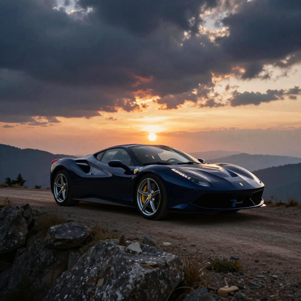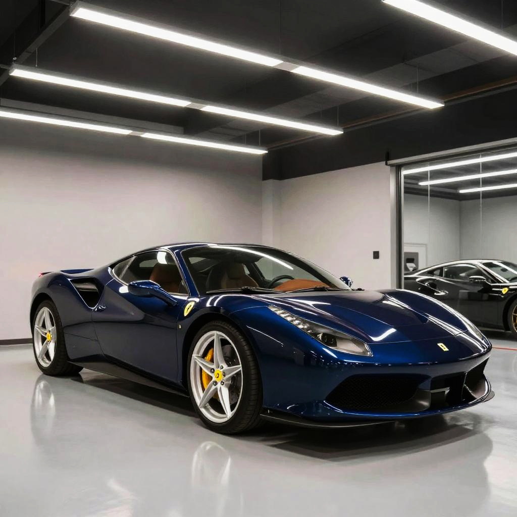 Dark blue Ferrari in a modern garage with LED lighting, polished surfaces, intricate car details, hyper-realistic rendering, photo-quality, clean and high-tech environment