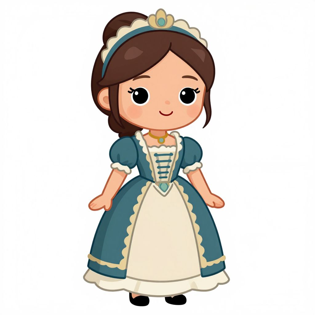 Cartoon-style drawing of a smiling young girl with dark brown hair, wearing a blue and white maid dress with puffed sleeves, white apron,