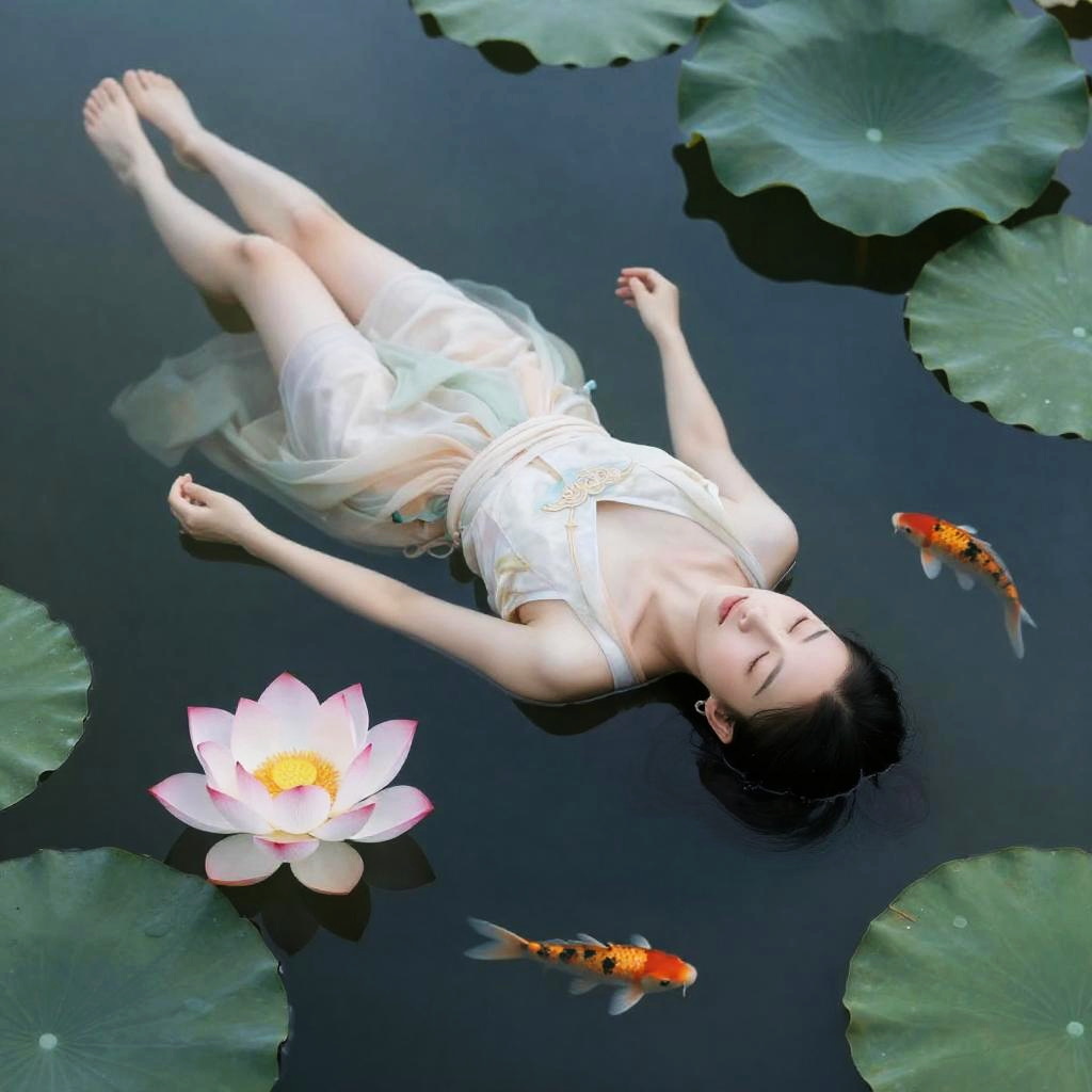 (masterpiece:1.3), (best quality:1.2), 8k, absurdres, (extremely detailed:1.2), highestres, photo, realistic, solo, (1girl:1.2), floating, water, afloat, (lotus:1.2), (reflection:1.1), lying, (koi fish:1.1)