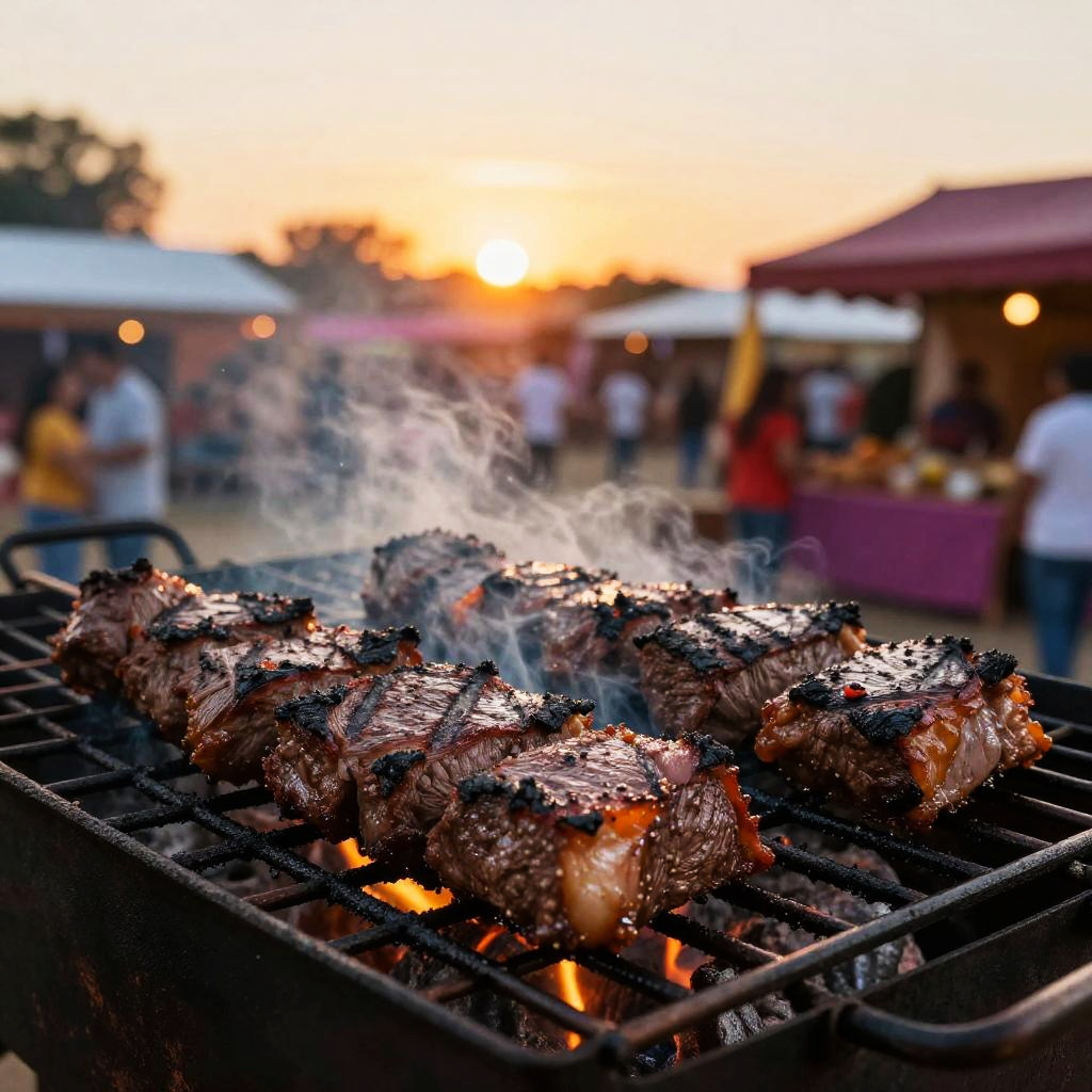 Carne asada дёж–‡ sizzling on a rustic grill at sunset, juicy marinated steak with char marks, vibrant colors, Mexican fiesta vibe, flavorful and inviting scene