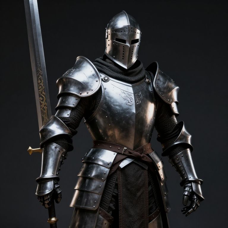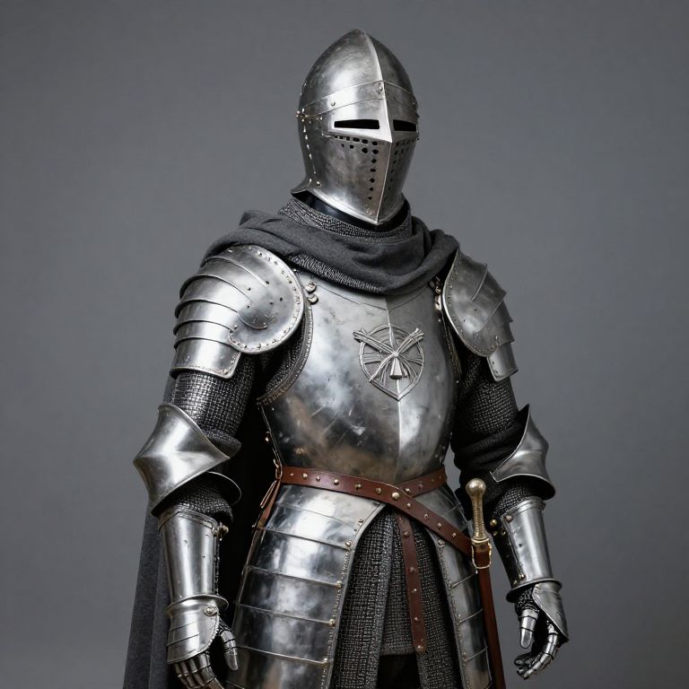 Mannequin wearing a medieval armor with a helmet and a cape.
