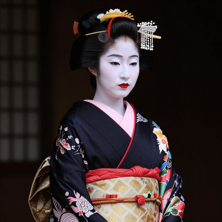 A geisha in traditional Japanese attire, adorned with intricate makeup and a colorful kimono, stands against a dark background.