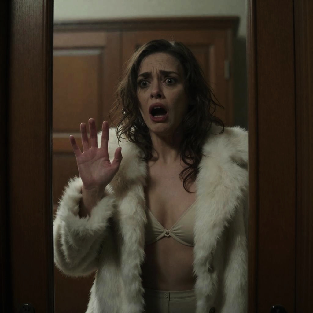 Woman with disheveled hair, open mouth in terror, pressing against a ured glass door. Wearing a white fur coat and beige bra. Brown wooden door and cabinet in the background. Her left hand is flat against the glass. Midnight horror movie scene.