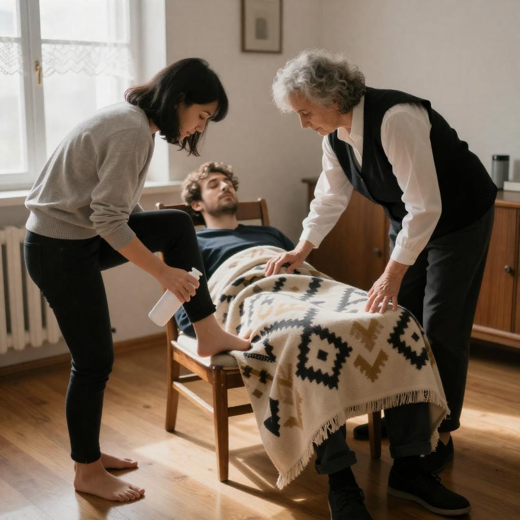 Three people in a room. Woman with medium-length black hair, light gray sweater, and black pants, spraying foot cream on a man's foot. Man lying on a wooden chair, wrapped in a geometric-patterned blanket, eyes closed. Older woman with curly gray hair, black vest, and white shirt, bending over him. Wooden floor, lace curtains, window, radiator, and brown wooden furniture in background. Man's black shoes on the floor. Sunlight filtering through curtains.