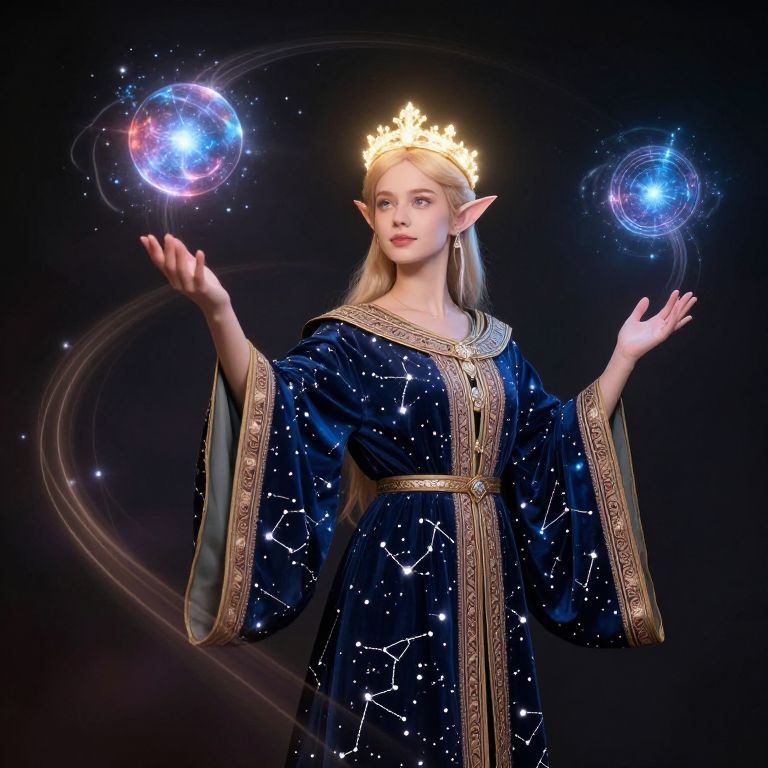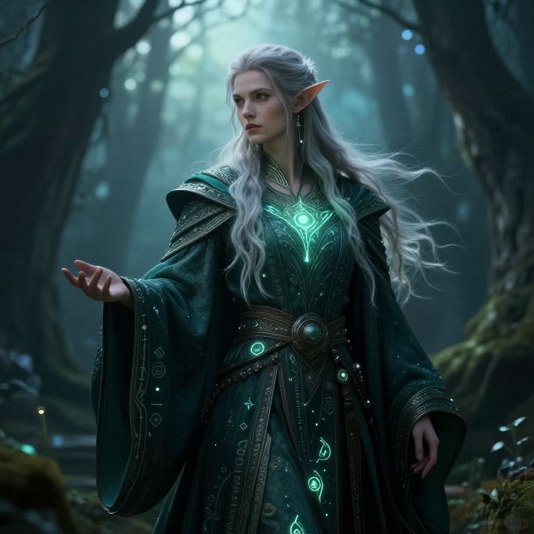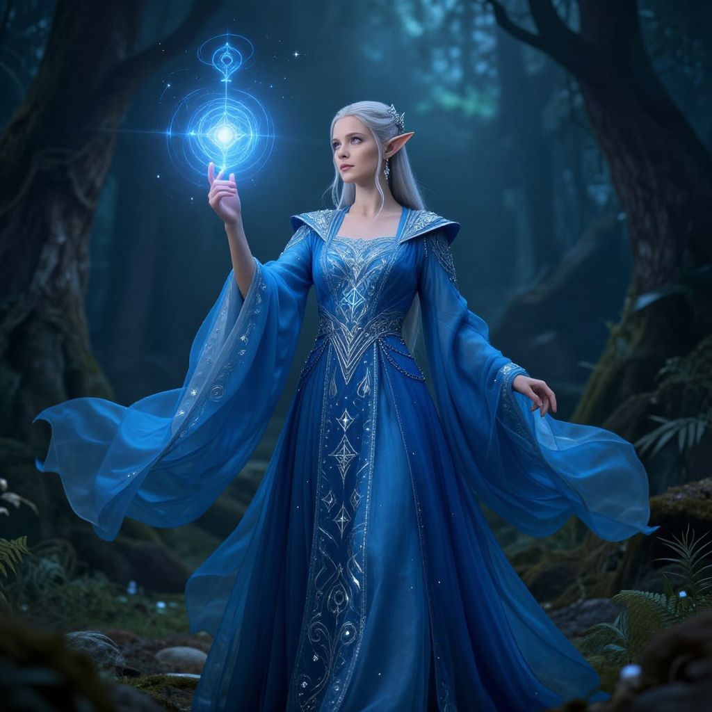 Create DnD character avatar, an elegant elf sorceress casting a glowing spell, flowing blue robes with silver embroidery, arcane symbols swirling around, mystical forest glade, magical atmosphere, fantasy art, sharp focus and textures.