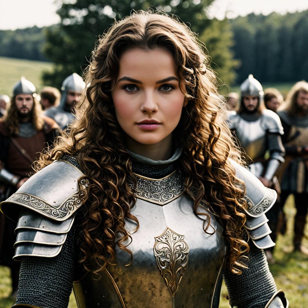 Fantasy movie costume ,1girl, long hair, blurry background, looking at viewer, armor, blurry, realistic, brown hair, medieval, solo focus, solo, outdoors, curly hair, closed mouth