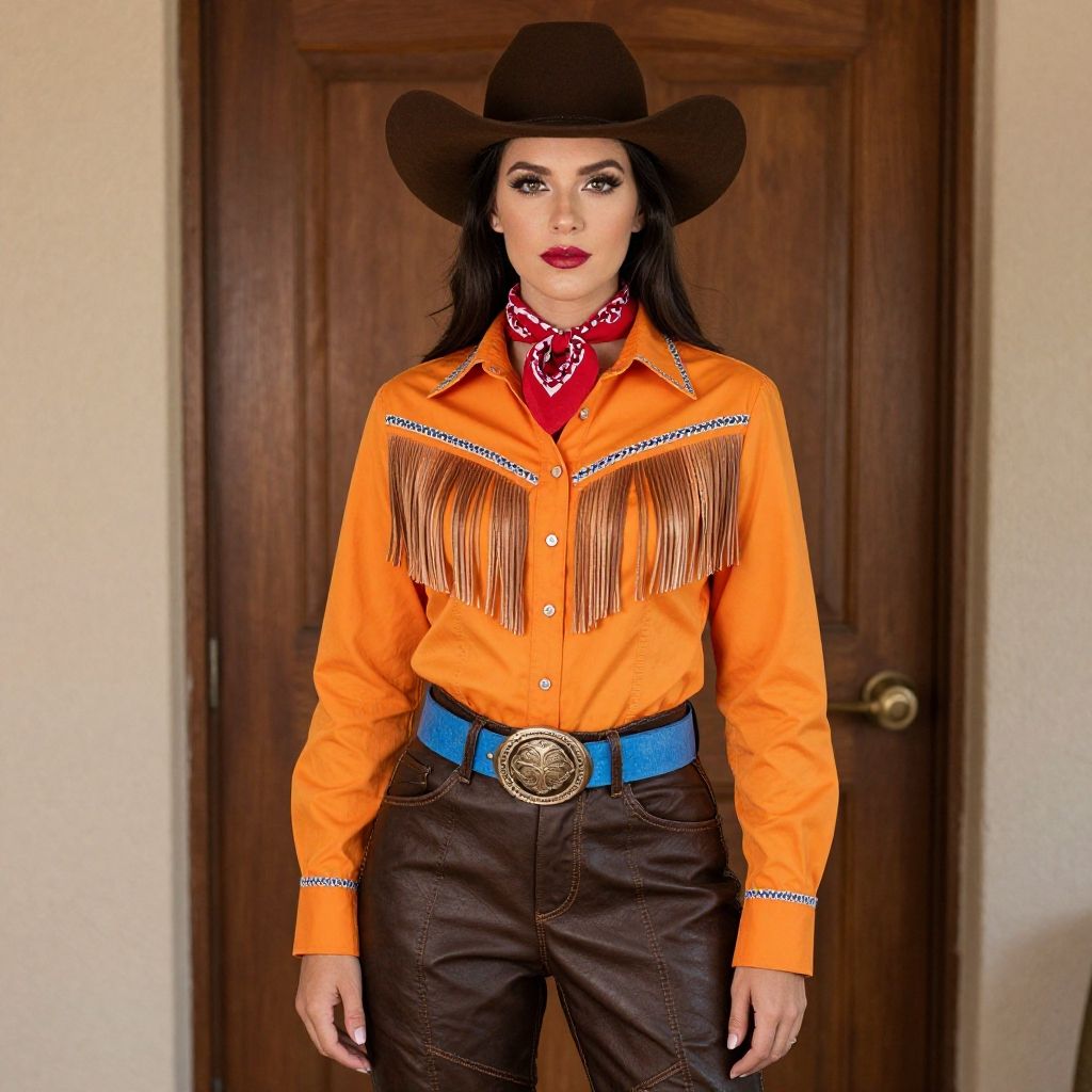 A confident woman dressed in a vibrant orange western-style shirt with fringe details, paired with dark brown leather pants and a blue belt. She completes her look with a red bandana around her neck and a classic brown cowboy hat, standing against a wooden door background.