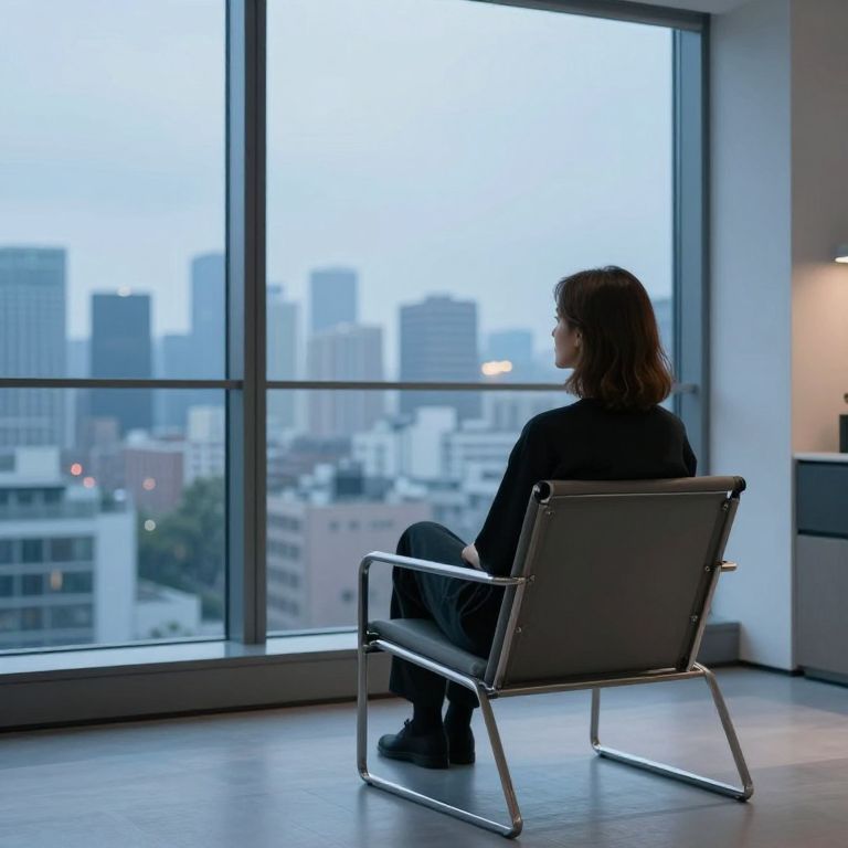 A modern minimalist interior in a quiet studio apartment, with a sleek gray metal and fabric seated chair set facing a large floor-to-ceiling window, a person with soft brown hair and neutral-toned eyes sits facing outward, looking at the city skyline in the background, bathed in soft blue twilight light.