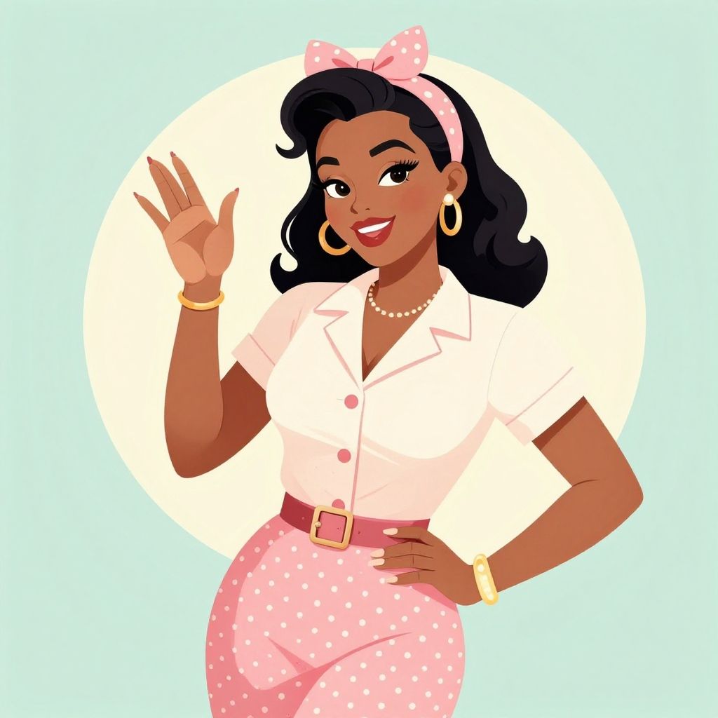 Ebony bimbo as a retro pin-up style illustration, wearing vintage inspired clothing and accessories, soft pastel color scheme with a playful and flirty expression, classic 1950s vibe