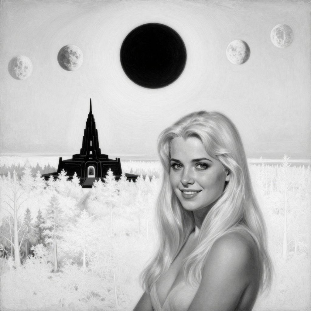 Black-and-white digital art: Smiling blonde woman with long hair in foreground, Gothic church silhouette, five moons, black sun in background.