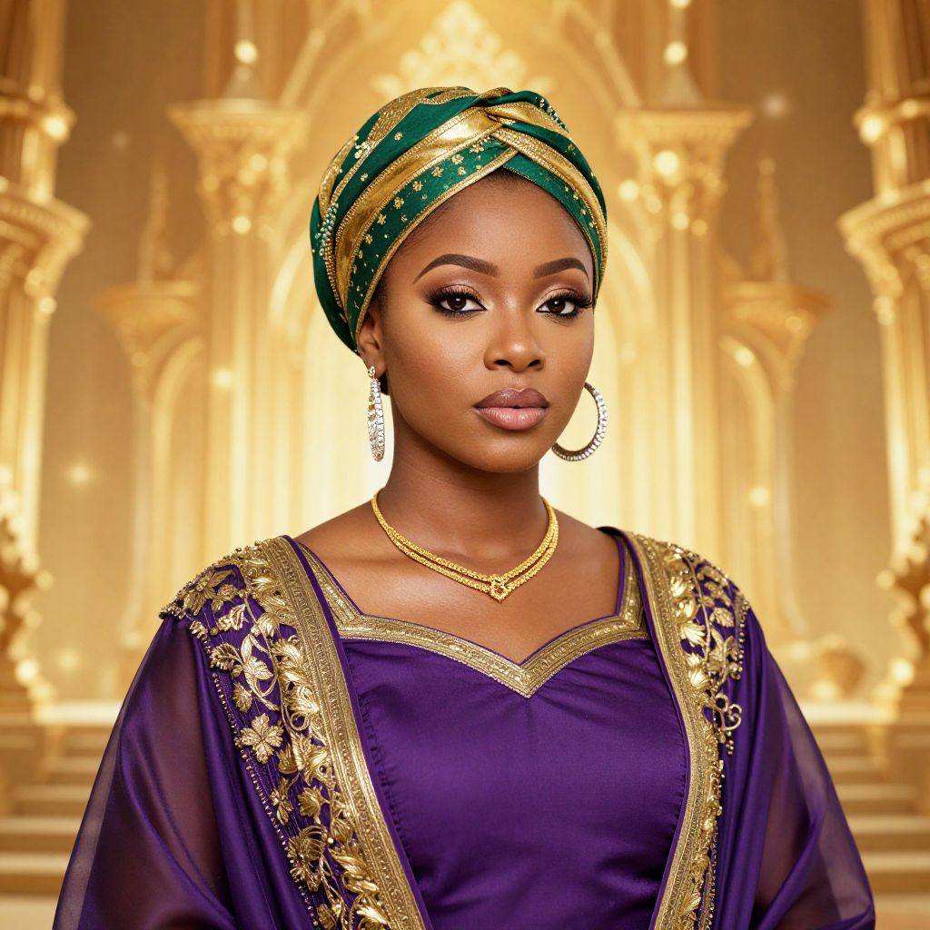 A woman in a purple and gold outfit, adorned with a green and gold head wrap, diamond hoop earrings, and a gold necklace, stands against a glowing, royal gold kingdom background.