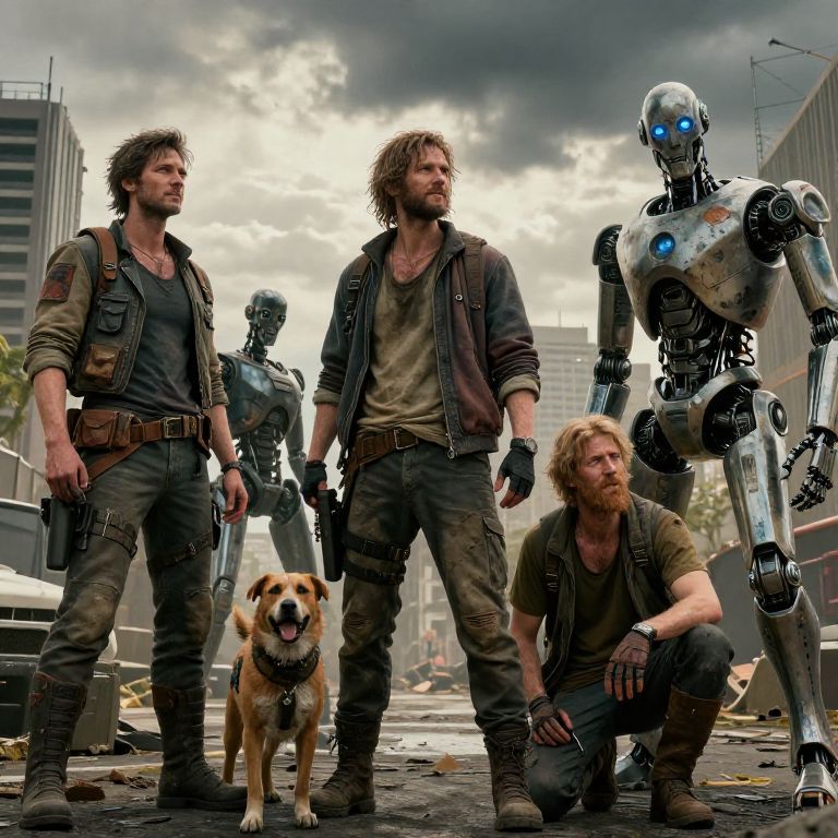 Open characters portrayed in a post-apocalyptic urban setting, wearing rugged and improvised gear, interacting with robotic companions under a dramatic sky, showcasing resilience and hope through gritty, cinematic lighting and textures.