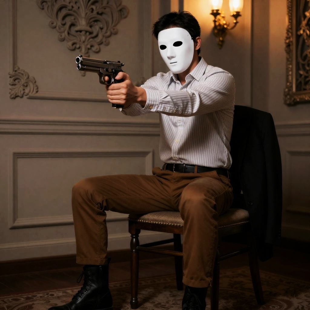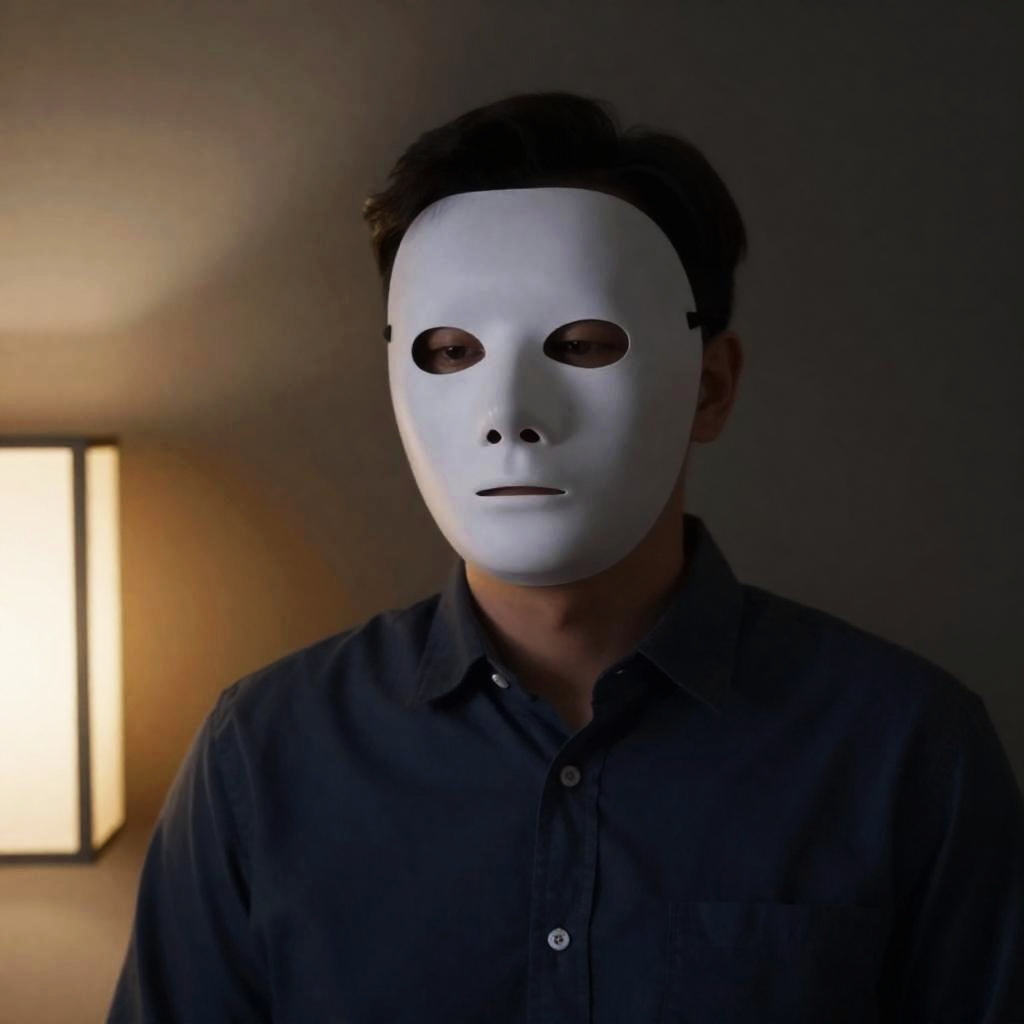 Photograph of a person with a white, featureless mask covering their face, wearing a dark blue shirt. Dimly lit, shadowy background with a glowing, rectangular lantern on the left. Person's expression is neutral, eyes slightly open. Lantern casts soft light on mask and shirt. Person is centered, slightly leaning against the wall.