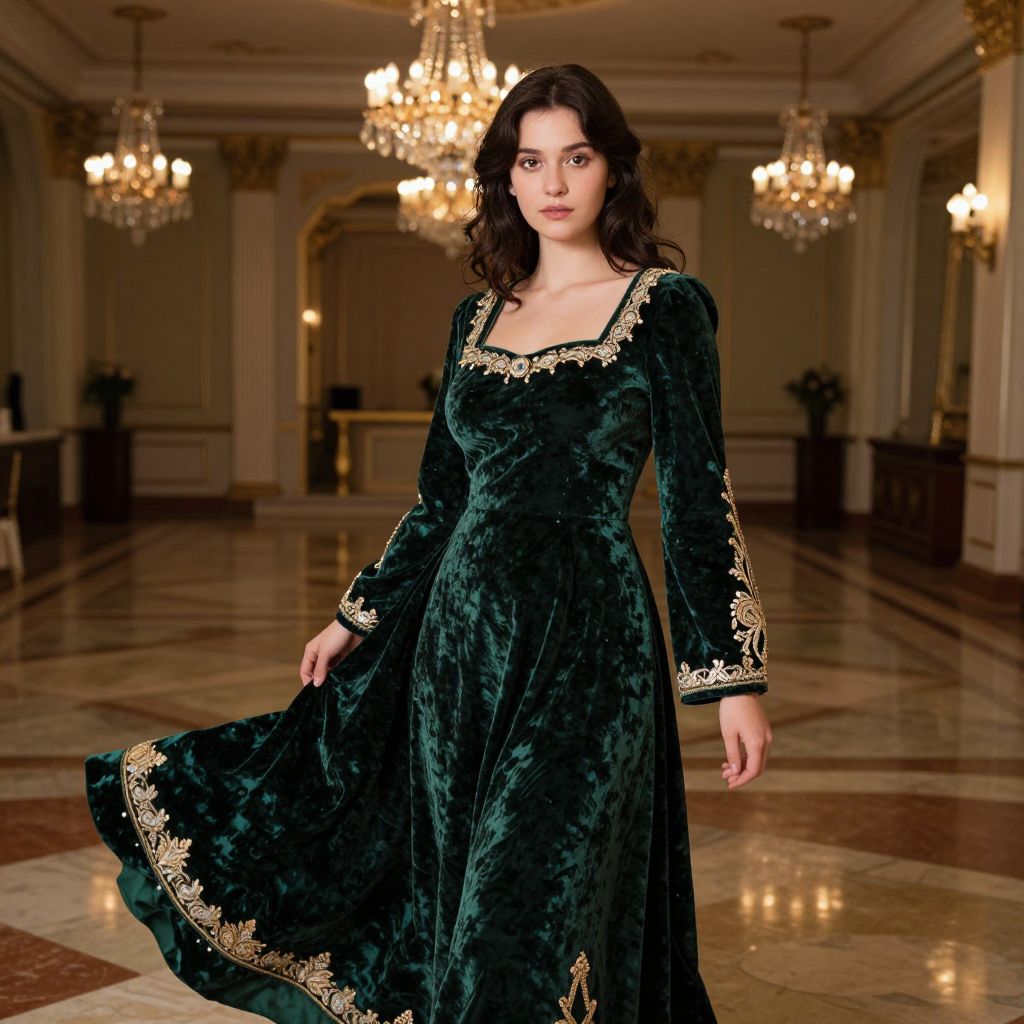 A detailed realistic photograph of a woman in her late 20s with soft brown eyes, fair skin, and loose dark brown hair wearing a luxurious green velvet gown, the fabric flowing elegantly over her figure, set against a dimly lit ballroom with crystal chandeliers and reflections on polished marble floors, the costume detailed with intricate embroidery and gold trim along the sleeves and hem, creating a vintage costume party atmosphere.. The woman has big tits and cute face