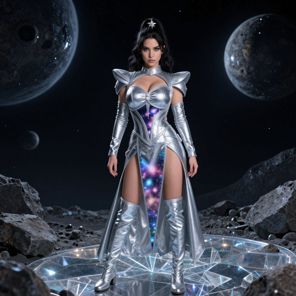 A fierce yet elegant woman in a space princess costume made of cosmic silver fabric and intricate galaxy designs, her silver boots clicking softly on a crystalline surface of a distant asteroid, her dark wavy hair tied with a star-shaped clasp, facial features sharp and defined with dark brown eyes and a fierce gaze, standing in a dark, mysterious cosmic trench between two planets, ultra-realistic photography style with deep space ambiance.. The woman has big tits and cute face