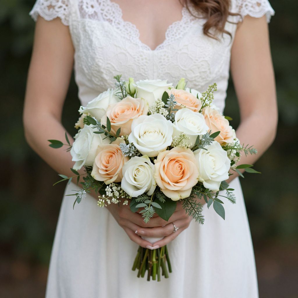 Elegant bouquet held gracefully by a woman in a lace-trimmed dress, showcasing a harmonious blend of white and blush roses complemented by green foliage and delicate accents.