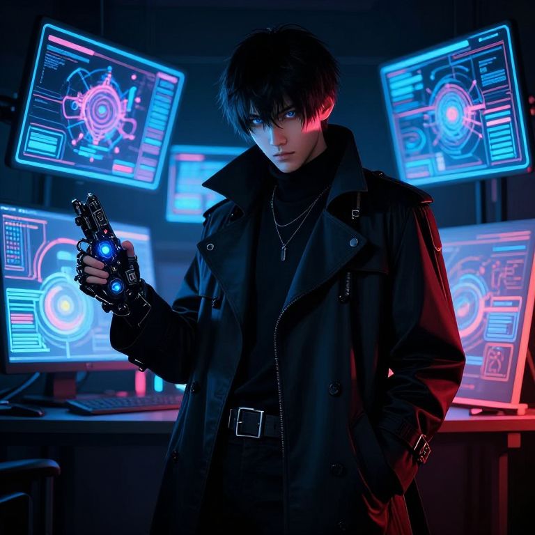 Cyberpunk anime-style photograph of a black-haired, pale-skinned young man in a dark coat, holding a glowing blue device, surrounded by neon