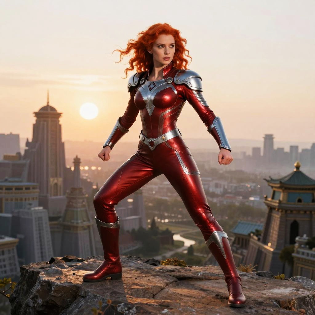 Redhead superhero posing heroically on a cliffside at dawn, red and silver armor shining under the rising sun, powerful stance, with an ancient mythical city in the distance