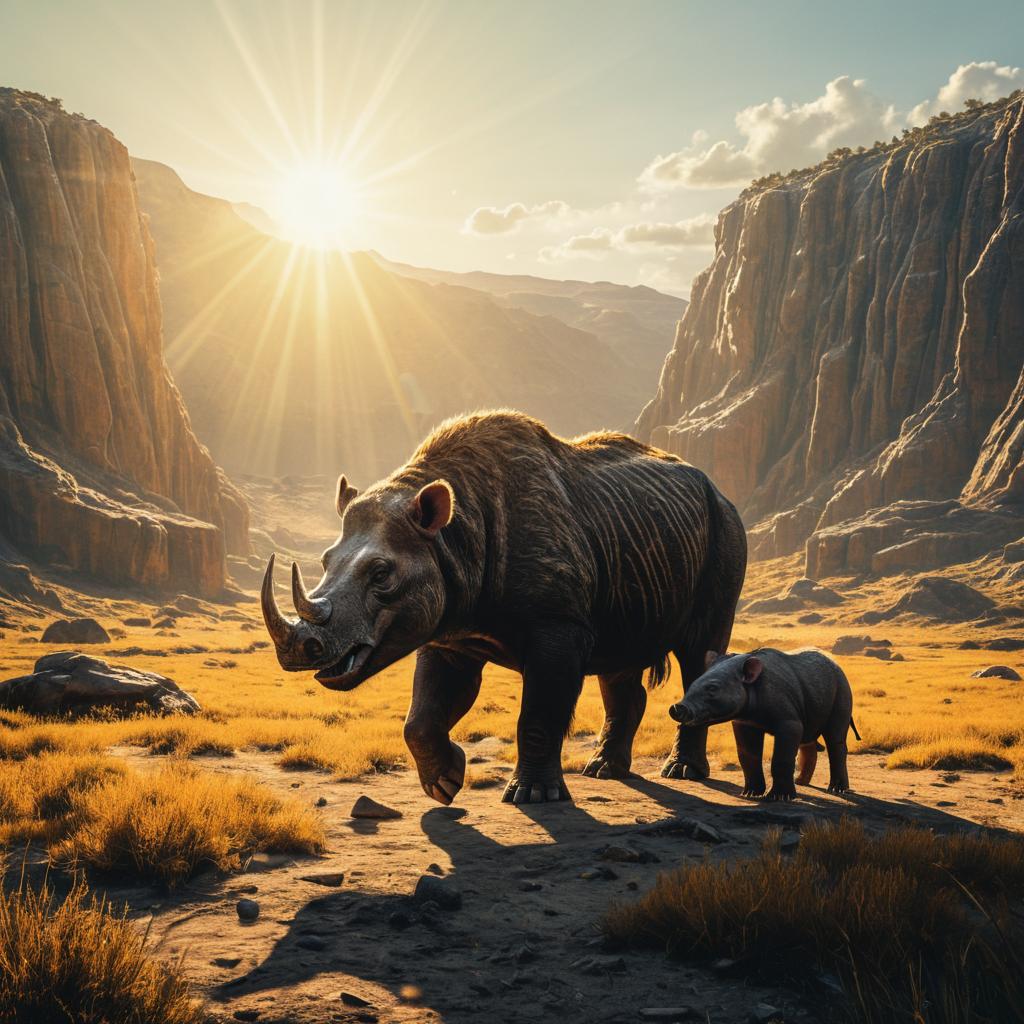 Paleoart illustration depicting an Entelodont Hell Pig and its cub in a vast, sunlit prehistoric landscape. The large, muscular ancient mammal with a powerful horn and thick skin stands alongside its striped cub, surrounded by rocky terrain and mountain ranges under a bright sun. The scene captures the ancient wildlife in its natural habitat during the prehistoric era.