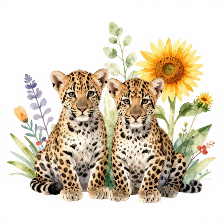 The image features two adorable leopard cubs, their fur adorned with a photorealistic watercolor pastel texture, set against a pristine white background. The cubs, positioned close to each other, exude a sense of curiosity and innocence. They are surrounded by an array of vibrant flowers and greenery, including a prominent sunflower and delicate leaves, which add a touch of natural beauty to the scene. The composition is harmonious, with the cubs and flowers arranged in a way that creates a balanced and visually appealing arrangement. The overall effect is one of warmth, tenderness, and the raw, untamed beauty of nature.