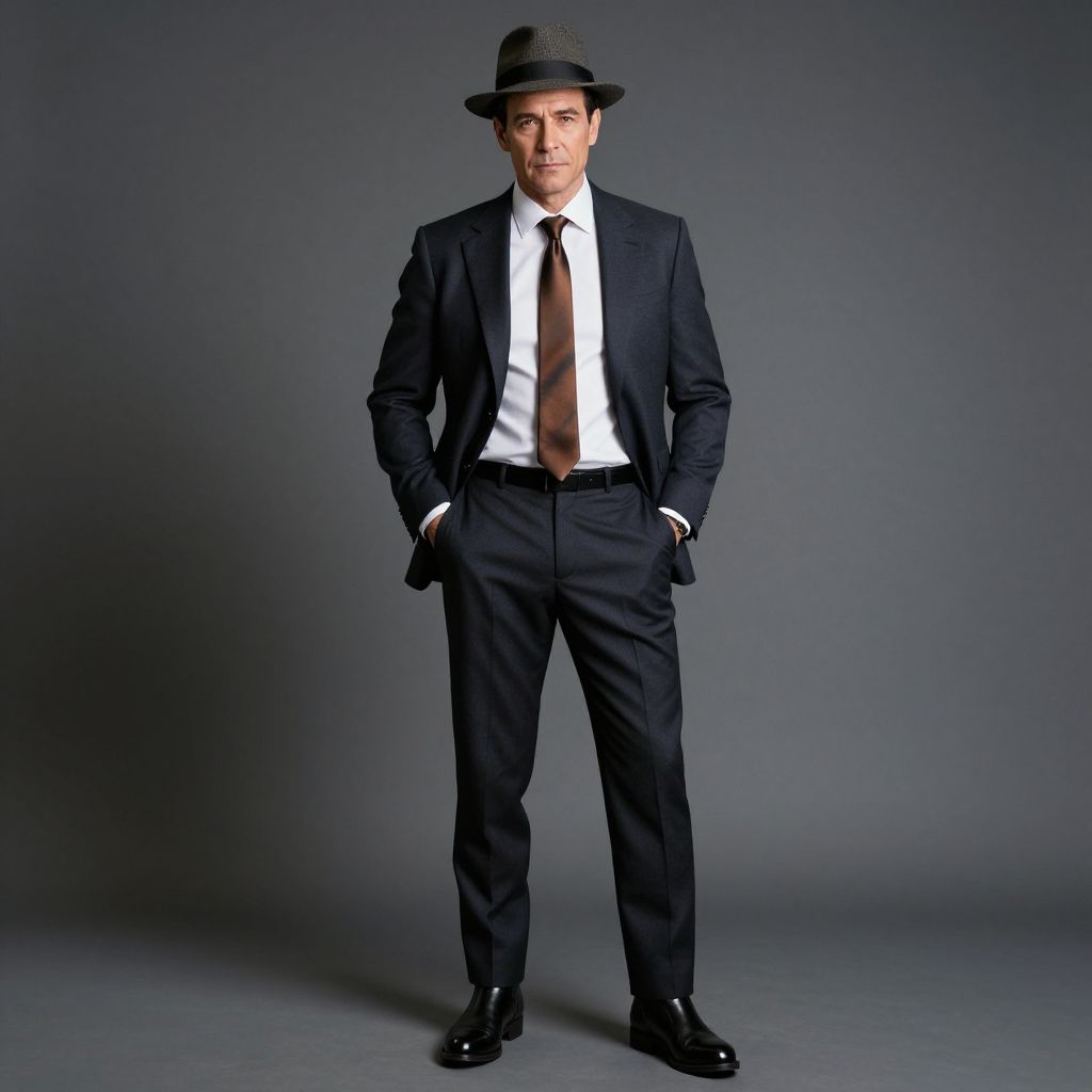 A handsome, middle-aged man with dark, slicked-back hair, standing confidently with his hands casually tucked into his pockets. He is impeccably dressed, wearing a fedora hat, a crisp collared shirt, a silk tie, a tailored jacket, and sharp pants. He completes the look with a pair of polished black boots. Cinematic lighting, high detail, photorealistic.