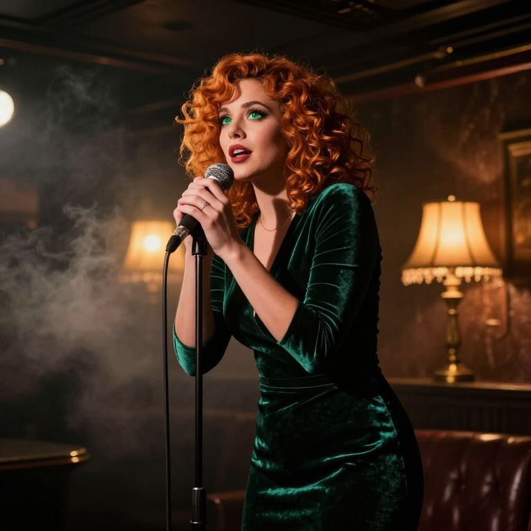 A captivating jazz singer with curly auburn hair and bright green eyes, standing at the edge of a smoky club stage, dressed in a deep emerald velvet dress, the fabric catching the low ambient light, the mood is moody and atmospheric with smoke and golden reflections, warm tones from vintage lamps, focused on her expressive face as she leans into the mic, soft glow from hidden lights behind her