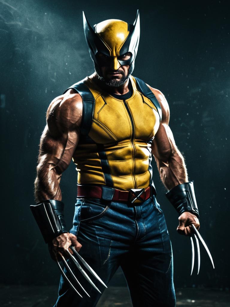 Muscular man dressed in a detailed Wolverine costume featuring a black cowl with pointed ears, leather suspenders, metal claws, and blue jeans. The cinematic, gritty studio portrait highlights his intense expression and well-defined physique.