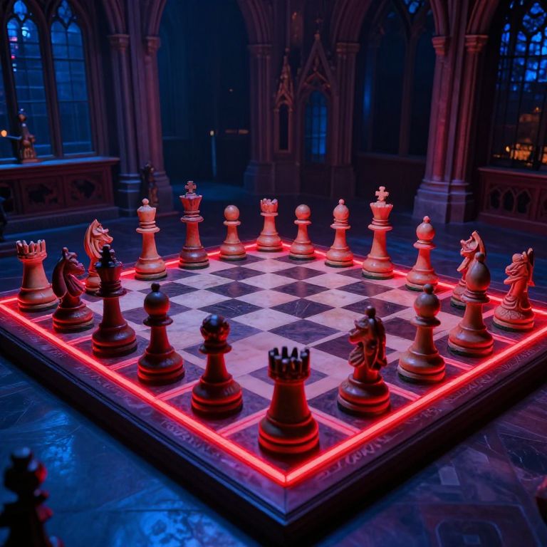Giant chessboard illuminated by red neon lights, featuring intricately carved stone pieces arranged in traditional formation within an opulent, gothic-style chamber bathed in ambient blue lighting.