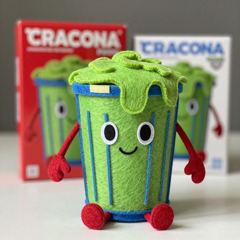 Felt A photo realistic toy with packaging of a character in a trash can with ooz ,arms, and legs. use the colors of bile green, red,blue.,