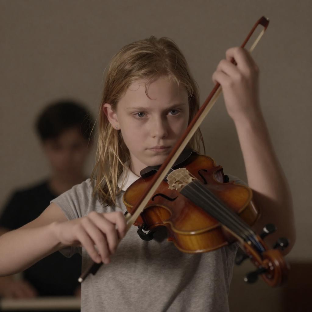 Young girl with wet, blonde hair playing a violin, wearing a gray shirt with a white collar. Dimly lit background. Serious expression. Right arm raised, holding the violin bow. Blurred figure in the background. Soft, warm lighting.
