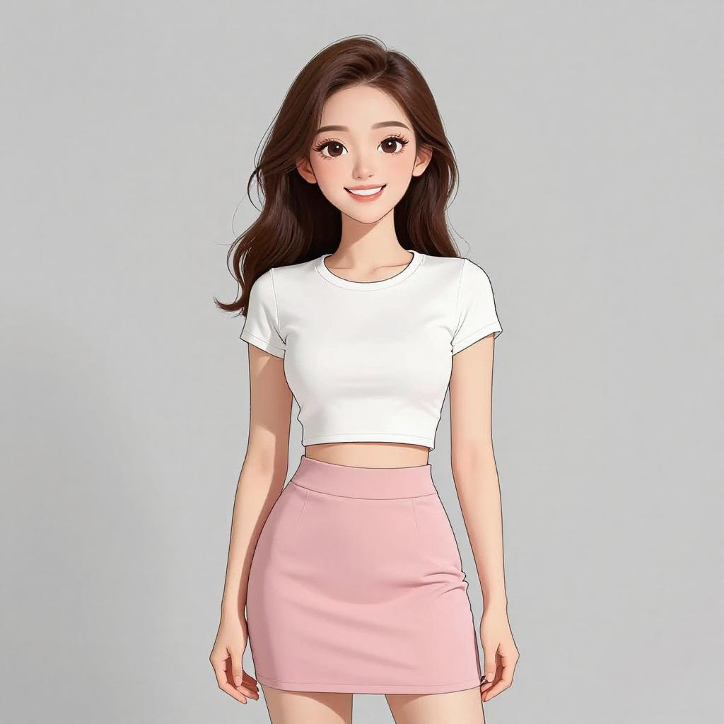 Woman with pretty face and pretty hair. smiling Woman, casual chic, textured white crop top with short sleeves, round neckline, layered front, pink fitted mini skirt, seamless finish, simple hair down with soft waves, plain studio background --sref 1467