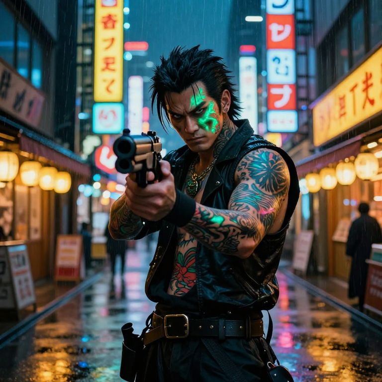 In this vivid cyberpunk scene, a Japanese Yakuza figure stands prominently in the foreground, his face and body adorned with intricate tattoos that glow under neon lights. He holds a futuristic, high-tech gun pointed straight ahead, exuding a menacing presence. The background is a bustling street in Tokyo, illuminated by vibrant neon signs that cast a neon glow on the rainy streets. Traditional Japanese shops line the street, their wooden facades adding a touch of authenticity to the futuristic setting. The overall composition is dynamic, with the Yakuza figure positioned centrally, his tattoos and gun creating a focal point. The interplay of colors, from the cool blues and greens of the tattoos to the warm yellows and oranges of the neon lights, creates a visually striking contrast. The rain adds a sense of movement and depth, enhancing the cyberpunk atmosphere.
