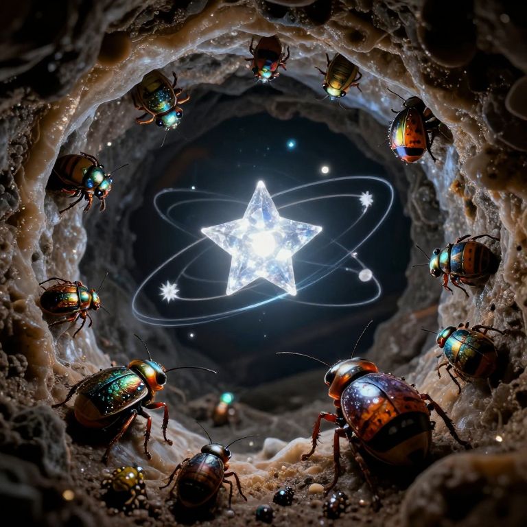 An underground civilization of insects has constructed a functioning planetarium within a geode, where each shimmering bug orbits a glowing crystal star.