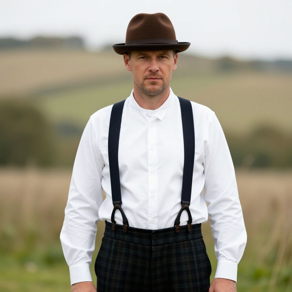 A man dressed in traditional British country attire stands outdoors in a rural setting with a blurred landscape in the background. He wears a brown felt hat, a white shirt with dark suspenders, and plaid trousers, embodying classic countryside fashion.