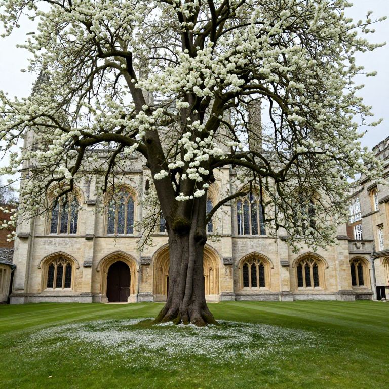 Photograph of a grand Gothic-style stone building with arched windows and doorways, featuring a large, central tree in full bloom with white flowers. The tree's trunk is thick and dark, surrounded by a circular patch of white flowers on the green lawn. The building's beige stone contrasts with the dark tree and bright flowers. The sky is overcast, adding a soft, diffused light to the scene. The image has a slight fisheye lens effect, emphasizing the tree's large size and the building's architectural details.