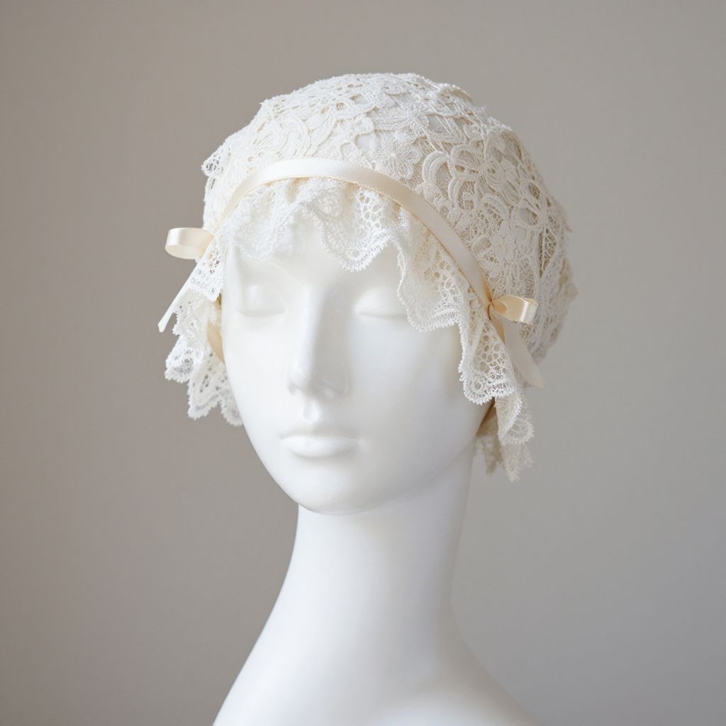 Elegant vintage-style sleep bonnet with intricate lace detailing and satin ribbons gracefully draped over a pristine white mannequin head, showcasing its delicate craftsmanship against a neutral backdrop.