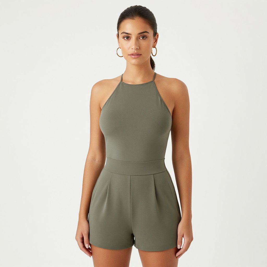 "Woman, minimalist chic, olive green halterneck romper, sleeveless, high neckline, fitted waist, pleated shorts, straight hem, hoop earrings, hair in a low ponytail, plain white studio background. Sexy. Pretty face and beаutiful eyes. Big breasts."