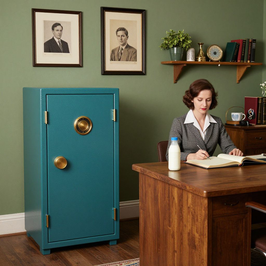 Vintage office scene featuring a teal safe with gold accents positioned to the left, a wooden desk with open ledgers and a milk bottle to the right, and a woman seated behind the desk, surrounded by a green wall adorned with framed artwork and a shelf displaying books, plants, and decorative items.