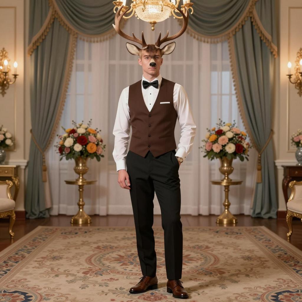 Stag costume groom, photo of man with deer antlers, formal outfit, brown vest, black bow tie, white shirt, black pants, brown shoes, standing, hand in pocket, elegant room, draped curtains, ornate chandeliers, floral centerpieces, detailed carpet, realistic, surreal, fantasy, portrait, centered, formal attire, elegant background, vibrant colors