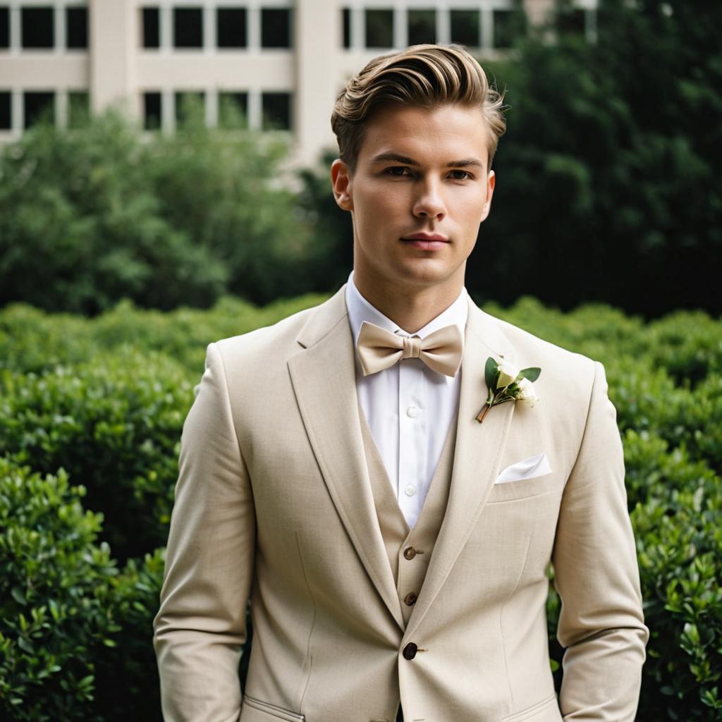 Groom stole style, photorealistic, young handsome man, light brown hair, styled up, wearing beige suit, white dress shirt, beige bow tie, small boutonniere on left lapel, confident expression, standing outdoors, blurred green bushes and building in background, natural light, daytime, realistic shadows, fashion photography style