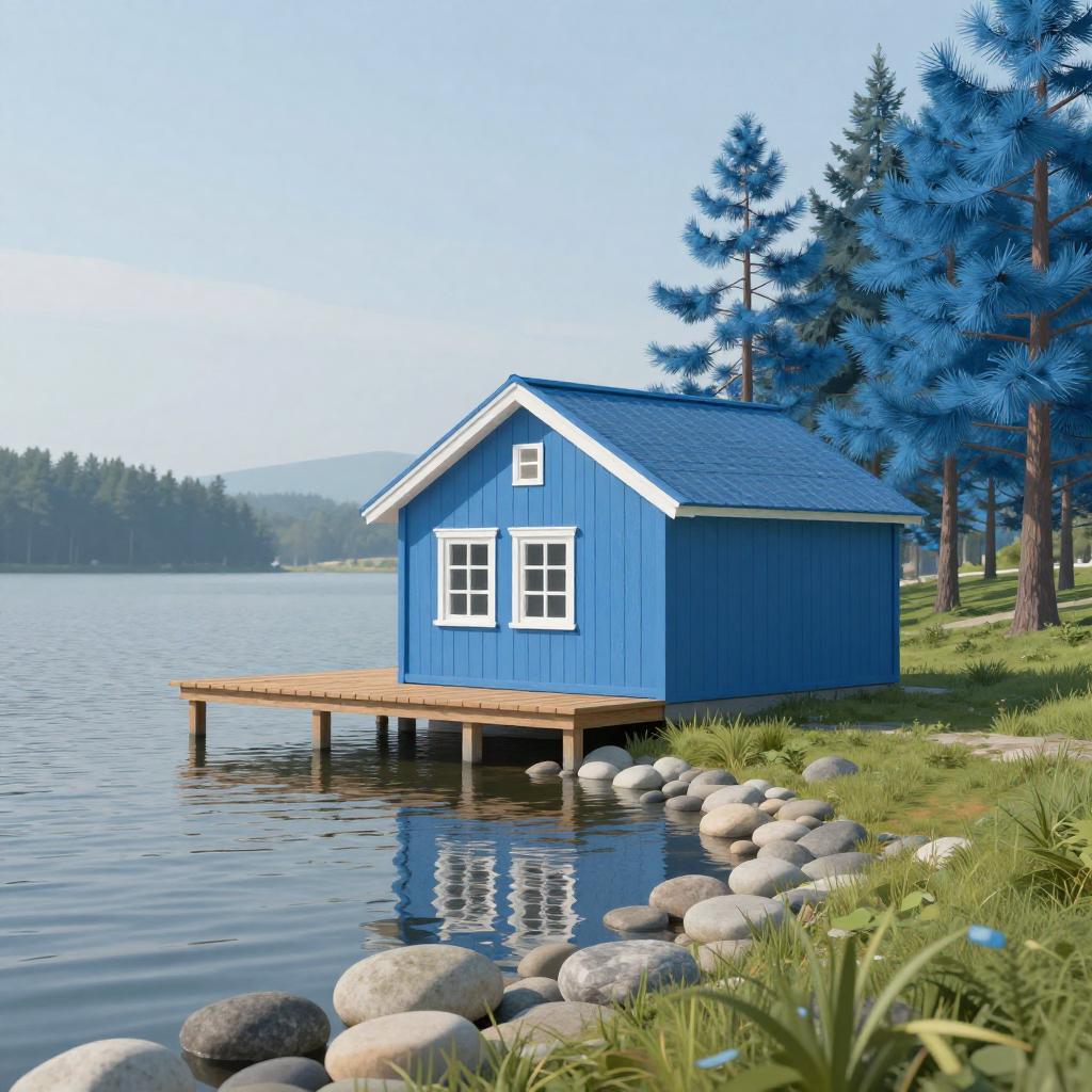 A minimalist artistic rendering of a blue wooden cottage situated by a calm lake with smooth stones lining the water's edge and stylized blue pine trees in the background. The scene features a wooden deck extending over the water and a gently sloping green grassy bank.
