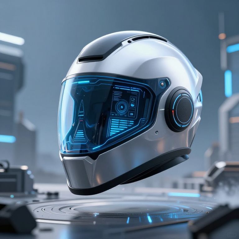 Futuristic helmet featuring a transparent visor displaying holographic interfaces, smooth aerodynamic design with silver and black color scheme, floating above a technologically advanced battlefield background, dynamic lighting and reflections