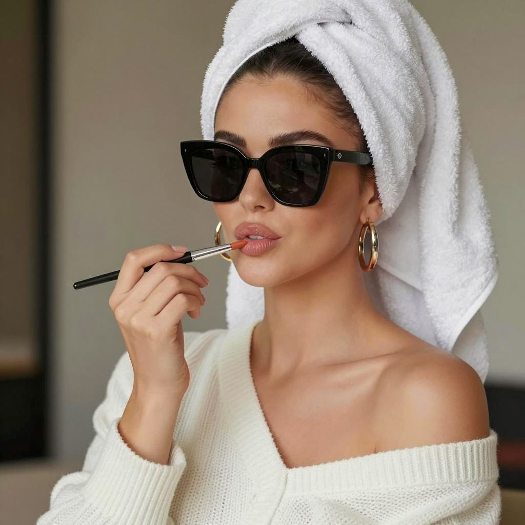 Woman with light brown skin, long black hair, wearing large dark sunglasses, a light gray knit sweater with cable patterns, and a matching wide-brimmed hat. She holds a red cocktail with a straw and green garnish in her right hand. She sits on a beige leather chair in a modern café. Large gold hoop earrings. Background includes blurred shelves with various objects.